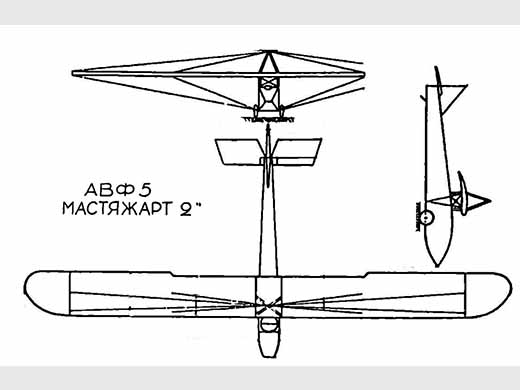 | Infos techniques | Le planeur AVF-5 "Mastyazhart-2" est radicalement différent du Mastyazhart de 1923. L'aile a un grand allongement pour l'époque (12,5), ce qui améliore sensiblement les qualités aérodynamiques du planeur. Il n'y a pas d'ailerons et le contrôle en roulis se fait par gauchissement des ailes, ce qui permet de réduire le poids et de simplifier la conception.
