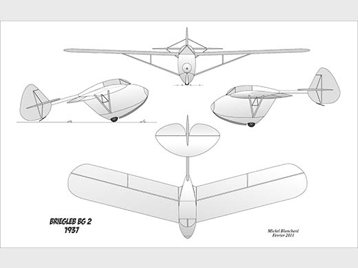 | Histoire résumée | An interesting new glider known as the Briegleb BG-2, a successor to the BG-1 Utility, has been completed by Briegleb Aircraft Company in Los Angeles. It was designed by William G. Briegleb, General Manager of the Company, and Mr. Donald E. Walters, its Chief Engineer. Flight tests have recently been completed at Rosemond Dry Lake. The BG-2 is a "shoulder-wing" design with sharply swept back wings equipped with flaps and boom tail. Fuselage and tail surfaces are of welded steel tube construction and wings are built up of wooden spars and ribs. V-struts, fastened above the bottom of the fuselage, form the wing bracing, and streamline wires brace the empennage. The most noteworthy feature of this ship is its small size. With a span of less than 27' it weighs in empty at 160 pounds. Mr. Briegleb states his purpose in designing this type of glider is five-fold. First, its small size enables it to be stored on its trailer in a 16' garage. Second, being small it does not require the work and materials of a larger ship, therefore the price can be kept low. Third, the upkeep will be low due to the small areas on the ship. Fourth, it can easily be handled and assembled on the field, and fifth, it can be towed by a small, low power car. The N.A.C.A. 2R12 Airfoil is used and the characteristics of this curve, together with the sweepback of the wings, give it good longitudinal stability, even with flaps all the way down. This enabled the designers to use a short fuselage. The first tests, in which the ship was towed to 2,000' in a three mile run on the dry lake bottom, were made with cockpit cover off and without wing root filleting. Subsequent flights have been made with the cover on, which greatly improved the performance. Additional improvement is expected when fillets are installed. The single wheel landing gear was found to be set too far back and this has been corrected. The tests of the flaps proved very satisfactory. With them one-third down the glider got off the ground quickly and had no pitching moment whatever. With the flaps pulled all the way down it descended very steeply, indicating that landings could be made in extremely small fields. The visibility from the cockpit is excellent and there is ample room, as is shown in the accompanying photograph. It should prove a very safe and practical glider for instruction and preliminary soaring. Advance estimates on the price are that it will be below $400.00 without flaps and not over $450.00 F. O. B. Los Angeles with them installed. | ||||||
