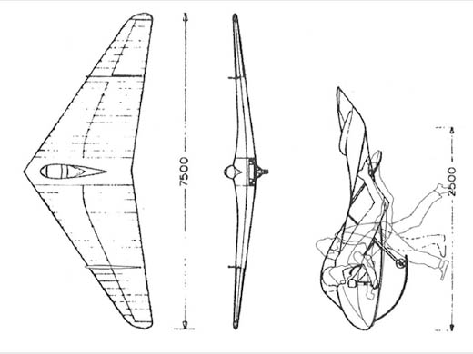 | Infos techniques | El modelo fue originalmente construido sin barreras verticales (Fences) ubicadas a las punteras del ala. Sin embargo el Dr. Karl Nickel, colaborador de Horten, opinaba que en situaciones de perdida la efectividad de los comandos podría reducirse significativamente. Habida cuenta de la baja velocidad a la cual volaría el Piernífero, Horten considero que dichas barreras podrían ser necesarias y fueron incorporadas. Los primeros vuelos fueron realizados por Bartolini y el planeador demostró ser una aeronave con cualidades de vuelo excelentes en todo su dominio operacional. En ensayos posteriores se quitaron las barreras comprobándose que eran innecesarias. Los únicos comandos con que se contaba eran elevones del tipo Frise. El sistema de control estaba constituido por una palanca que movía los cables que actuaban sobre los elevones. El viraje se lograba por freno aerodinámico, así cuando el bastón de mando era llevado hacia la izquierda el elevón de ese lado se levantaba y su borde de ataque sobresalía por debajo del perfil del ala, esto aumentaba la resistencia y la aeronave giraba hacia ese lado. El radio de viraje era reducido, cercano a 11 m. Esto se determinó cronometrando el tiempo de una serie de virajes escarpados a velocidad constante controlada con velocímetro y variómetro. Se presento la dificultad de que al comienzo del viraje aparecía una guiñada inducida adversa con respecto al giro pero la efectividad del comando eliminaba el inconveniente. Comparando el Ho-Xa Piernífero con un Grunau Baby II en remolques dobles , se comprobó que a velocidades superiores a 90 km/h el Ho-Xa tenía una relación de planeo superior. El Ho-Xa estaba construido en una sola pieza con largueros, costillas y recubrimiento activo convencionales. El larguero parabólico era de pino Romania y formaba un ángulo de 45° con el eje de las costillas lo que hizo complejo su montaje, ver Fig. 3.5. El recubrimiento era de madera terciada de 0.8 mm y colocarlo fue la parte más delicada del trabajo ya que a la forma de los perfiles se sumaba la curvatura frontal del ala en el extradós. El piloto se ubicaba en la zona central del ala en posición semiprona apoyando el tórax en una tabla inclinada 30° respecto a la horizontal y sujetándose con correas. El ángulo de la espalda a 30° se mantenía tanto corriendo como en vuelo. Al levantar vuelo se accionaba un mecanismo que levantaba una tabla donde el piloto apoyaba las rodillas y los pies. La cabeza era apoyada en un barbijo. La elección de la posición semiprona se debía que el piloto no tenía la necesidad de levantar tanto la cabeza para mirar hacia delante (como en la posición prona) lo que hacia a esta posición menos cansadora para vuelos largos, además de gozar de una visibilidad hacia abajo y el frente excelente. También la menor área frontal de la cabina era menor. | ||||||