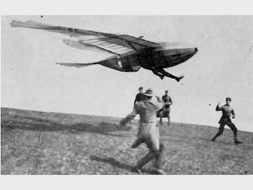It was similar to a hang glider in that the take-off gear was the pilot's legs. Skids, however, were provided for landind, a most sensible precaution. It flouted normal aerodynamic convention in that no vertical tail surface was provided. The most radical feature was the "auxiliary" power that was supposed to be provided after take-off by the pilot through his legs. A set of flippers was installed on the fuselage just aft of the wing. The purpose of these was to beat up and down like the wings of a bird to propel the machine forward. Take-off was to be made with the pilot's legs serving as the "running" gear, assisted by a towrope and after the ship was airborne, the pilot was supposed to pull his legs up, place his feet on pedals connected to the flippers and pedal like mad to keep the ship airborne.
