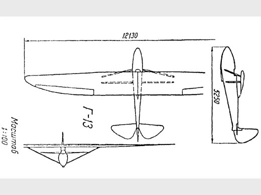 | Histoire résumée | Le G-13 a été basé sur le G-9 en 1933 en tant que planeur d'entraînement et a volé avec succès lors du 9ème meeting de Koktebel, si bien que l'année suivante, il a été décidé de construire un ou deux autres prototypes, ayant préalablement éliminé les inconvénients constatés. Une version améliorée, dotée d'une plus grande envergure, a été désignée G-13bis. En raison des renforcements structurels supplémentaires, le poids de la cellule vide passait de 86 à 112 kg. En 1934, deux exemplaires du G-13bis ont participé avec succès au 10ème meeting de vol à voile de Koktebel. Bien que le G-13bis ait donné de bons résultats, il n'a pas été construit car les planeurs «Упар» d'OlegK. Antonov, d'un usage similaire, étaient déjà produits en série. | ||||||