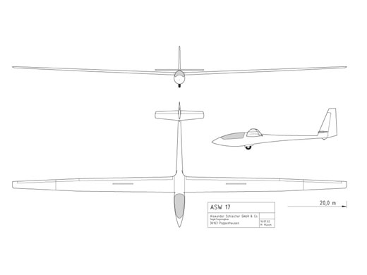 | Liens WEB | Site : Alexander Schleicher . Note + plan 3 vues + specs. (2013-11-09 CL) Site : Wikipedia . Note + specs. (2013-11-09 CL) Site : Sailplane Directory . Note + photo + specs. (2014-10-14 CL) Site : Richard Cawsey . Les ASW-17 produits. (2014-10-14 CL) |
