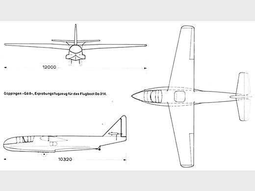 | Histoire résumée | En 1939 Wolf Hirth crée sa propre firme après s'être séparé de Martin Schempp. Il embauche Wolfgang HÜTTER comme chef du bureau d'études, dont le premier travail porte sur les contrats passés avec la firme Dornier pour les Gö-8 et Gö-9. les Le Gö-8 est un modèle réduit au 1/5 du projet d'hydravion géant Dornier 214. Pour les essais de stabilité hydrodynamique des flotteurs intégrés à la coque, le modèle était tracté par un bateau. Ces essais furent menés en collaboration avec le laboratoire d'aérodynamique de Göppingen. | ||||||