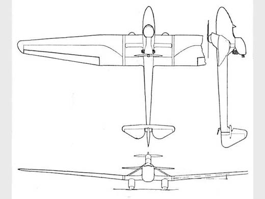 | Infos techniques | Construction en spruce et contreplaqué. La partie centrale des ailes, de 2,3 m, vient de construction avec le fuselage. Moteur sur pylône fixe.Moteur standard Anzani, bicylindre en V de 54 CV. Mais peut aussi être équipé d'un Scott Flying Squirrel de 34 CV ou d'un Douglas Sprite de 25,4 CV. Hélice propulsive. Muni de volets freins au bord de fuite, à l'intrados. Prix de vente 325 £. | ||||||
