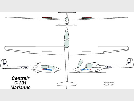| Histoire résumée | Le Centrair 201 Marianne est un planeur d'entraînement biplace en tandem, conçu et construit en France dans les années 1980. Suite à une commande de la Fédération française de vol à voile [F.F.V.V.] Il était destiné à remplacer les nombreux planeurs Wassmer Bijave vieillissants qui équipaient les clubs de vol à voile français ; lorsque Centrair a cessé ses activités en 1988, quelque quatre-vingts Mariannes avaient été vendues. La Marianne a effectué son premier vol le 19 septembre 1985 et a été homologuée le 29 janvier 1987. Il existait des plans pour des versions ultérieures : un planeur d'entraînement avancé avec des volets et un train d'atterrissage rétractable ; une Marianne plus performante avec une plus grande envergure (20,9 m ; 68 ft 7 in) ; et une version motorisée. Aucune de ces versions ne semble avoir été construite avant que Centrair ne cesse ses activités. | ||||||
