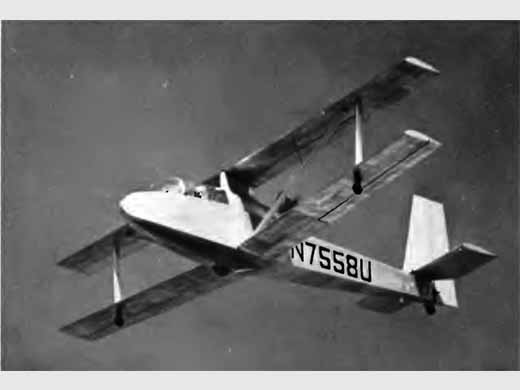 The 65-1 is one of the very few biplane motor gliders. The powerplants are two 8hp West Bend 820 single-cylinder go-kart engines mounted on small booms extending from aft of the cockpit, and driving two-blade fixed-pitch pusher propellers. Construction is all-metal, the single-spar wings having aluminium skinning and unbalanced piano-hinged ailerons; the upper wing has flaps along 60% of its span which can be lowered to four positions, the maximum deflection being 35°. There is a single interplane strut and bracing strut on each side. The slab-sided fuselage is built up from aluminium extrusions and is also covered with aluminium; the landing gear consists of a monowheel mounted in an under-fuselage fairing, a steerable tailwheel and two small outrigger balancing wheels under the lower wings below the interplane struts - these are actually Sears ballbearing lawnmower wheels. The pilot sits under a single-framed cockpit canopy that hinges to port for entry and exit. The prototype 65-1 had a wing area of 100sq ft and was followed by a second prototype with a wing area increased to 180sq ft and two engines mounted inboard in the fuselage and driving belt-driven propellers mounted on outriggers.