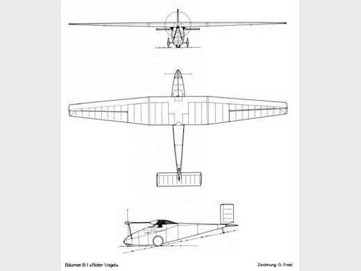| Histoire résumée | Au concours de la Rhön, en 1924, une catégorie pour les planeurs à moteur auxiliaire [Segelflugzeuge mit Hilfsmotor] est créée. Paul BAÜMER décide de participer et, avec les frères Günther, il construit le Roter Vogel, dérivé du Hannover H-6 Pelikan. Il gagnera le concours. L'appareil est accidenté sur l'aérodrome de Fuhlsbüttel le 29 décembre 1924. La reconstruction d'un second appareil fut entreprise dans les ateliers de Bäumer Aero, en réutilisant ce qui pouvait l'être de l'épave. La construction fut achevée en avril/mai 1926 et le Roter Vogel II fut présenté à l'exposition de Gesolei à Düsseldorf de mai à octobre 1926. Après l'exposition quelques réparations furent nécessaires et Paul Bäumer ne put effectuer le premier vol que le 15 décembre 1926 à Fuhlsbüttel. En Juillet 1927 le Roter Vogel II a été exposé dans le hall de Fuhlsbüttler Bäumer GmbH Aero, lors des funérailles de Paul Bäumer, mort accidentellement le 17 juillet à Copenhague lors d'un vol d'essai d'un chasseur Rohrbach Rofix. A partir de la mi 1927, après la création de la R.R.G., cet organisme a utilisé le Roter Vogel II pour des recherches. En 1928, le motoplaneur a dû être retiré du service. | ||||||