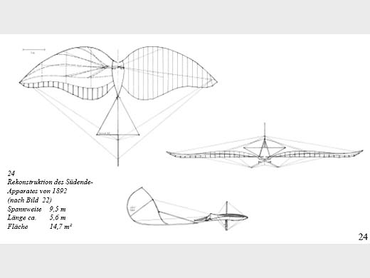 | Histoire résumée | Durant l'été 1892, Otto Lilienthal réussit avec cet appareil des vols de 80 m (avec une hauteur de chute de 10 m) sur le bord d'une carrière de sable, à Südende, dans la région de Berlin (DE). | ||||||