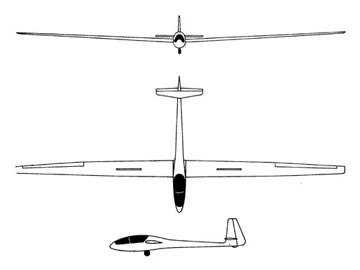 | Infos techniques | Le Cirrus original avait une envergure de 17,74 m et un profil relativement épais, sans volets de courbure. Aérofreins à une lame à l'intrados et l'extrados. Un parachute de freinage est installé en dessous de la dérive. Le train d'atterrissage est escamotable. Les deux prototypes [D-9406(1) (ZS-GFV) et D-9406(2) (D-8437)] avait un empennage papillon (empennage en V), puis tous les autres exemplaires eurent un empennage cruciforme. Le l'envergure et le profil avaient été optimisés pour le petit temps de l'Europe centrale, ce qui donna d'excellentes caractéristiques en vol de thermiques et une grande finesse (pour l'époque). All-fiberglass glider, with foam core sandwiches for the wing skins and fuselage bulkheads. Internal tubular-steel frame interconnects the wings, cockpit and landing gear, carrying the flight and landing stresses. This steel frame is bolted to the fiberglass shell. The Cirrus was built in female moulds, an innovation that became the standard method for all manufacturers. | ||||||||