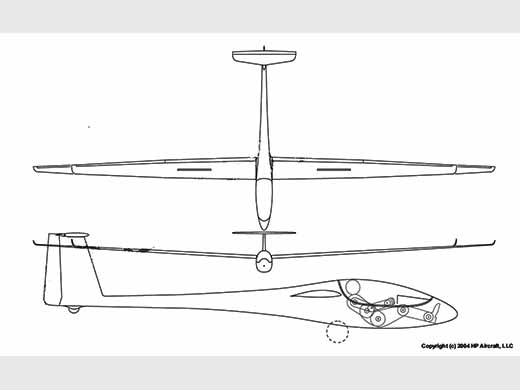 | Infos techniques | L'aile est dessinée pour une envergure de 15 m, mais des extensions peuvent la porter à 18 m. Un ballast d'environ 100 L est prévu. Par rapport au HP-18, le cockpit a été modifié pour une meilleure visibilité et un plus grand confort pour les pilotes de grande taille. Empennage en T. |