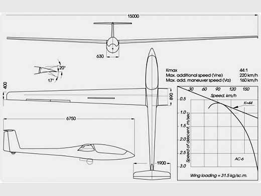 The AC-6 is a 15 m (49.2 ft) wing span development of the 12.6 m (41.3 ft) span AC-5M, with longer, higher aspect ratio wings terminating in winglets. Like the AC-5, the AC-6 wing employs a Wortmann FX 60-157 airfoil. Assembly of the wing to the fuselage uses a cam pin and incorporates automatic hookups for the ailerons and air brakes. The landing gear is a retractable 360 mm (14.2 in) tire monowheel gear suspended with a pneumatic-hydraulic shock absorber. The wheel has a lever and cable operated drum brake. The cockpit can accommodate pilots up to 190 cm (74.8 in) in height. The canopy provides 300° field of view and is jettisonable. |