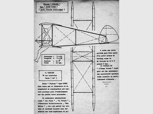 | Histoire résumée | Planeur de type Chanute, extrapolation du type Sport. " Notre "Chanute" type SPORT bien connu pour sa robustesse et sa simplicité de construction est surtout pratique pour l'entraînement sur des pentes assez prononcées. De nombreuses publications comme Les Ailes, La Nature, L'Education Professionnelle, Mon Métier, etc, ont publié les lettres de lecteurs donnant tous les détails sur leur expérience du pilotage de cet appareil particulièrement robuste et maniable... A noter que cette cellule peut être munie d'un petit moteur de Karting comme le Mc Culloch de 10 CV pesant 5 kg. La formule de "l'Homme Volant" intégral est dès maintenant une possibilité sportive toute nouvelle et particulièrement attirante." | ||||||