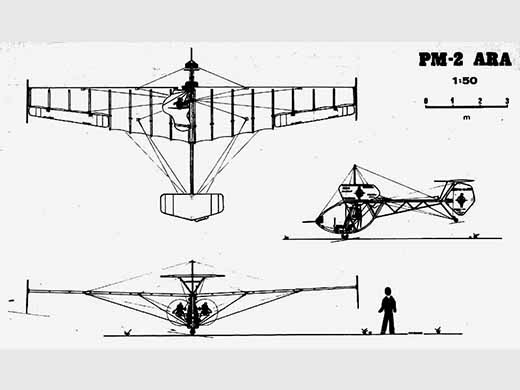 | Histoire résumée | Le PM-2 "Ara" a été conçu par George Majewicz et Andrzej Piotrowicz, à partir de l'ULM très populaire "Quicksilver-E". La construction a été faite au Centre culturel de la jeunesse de Cracovie Nowa Huta, par une équipe de 9 jeunes âgés de 16 à 19 ans. Dans un premier temps, l'appareil était équipé d'un seul moteur. Devant le manque de puissance de ce moteur il a été décidé de reconstruire une version bi-moteur. Les travaux ont duré plus de deux ans et le PM-2 a été volé pour la première fois en juin 1981 près de Cracovie. | ||||||