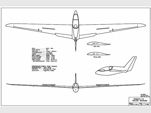 | Infos techniques | The Pioneer 4 is heavier, has a higher aspect ratio and slightly less wing area, and sports a new airfoil. Additionally, the wing structure differs greatly from the Pioneer 3 in that rather than having omposite wing ribs and fabric covering, the Pioneer 4 uses a foam core which is used through the entire wing and is covered in ’glass, just as in aeromodeling. It has a retractable wheel and built-in skid plus water ballast capability. Wing loading with water ballast : 36 kg/sqm | ||||||||