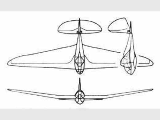 | Infos techniques | Décollage et atterrissage se faisaient en courant puis les jambes et le buste étaient repliés à l'intérieur du fuselage. Il n'y a pas d'aileron sur le dessin 3 vues, bien qu'une photo (non reproduite) montre un planeur équipé de ces gouvernes. | ||||||