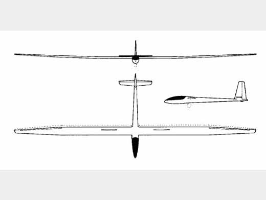 | Infos techniques | Aile en 3 parties, de 23m (75 ft 5.5 in) d'envergure, and the aerofoil flaps are chain-operated by a crank in the cockpit and can either be fully extended or fully retracted, no intermediate position being possible; when fully extended or retracted the wing profile is changed so as to result in a continuous Eppler aerofoil section. A tank to contain 132 lb of water ballast is situated in the leading edge of each wing centre section, the latter being 21 ft 4 in in length and the two outer panels 27 ft 0.75 in each. The single-spar wings have riveted duralumin double-T spars, and plywood/balsa/plywood sandwich outer skins formed by vacuum pressing; Schempp-Hirth air brakes are fitted. Landing gear consists, as it did on the AN-66-2, of a retractable monowheel and tailskid. The wing area is increased from 172.2sq ft with the flaps in, to 206.7sq ft with flaps extended, when the aspect ratio is 27.6 compared to 33.1 with the flaps in. Empennage conventionnel en croix. | ||||||