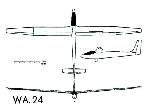 | Infos techniques | [Extrait de l'encart publicitaire préparé par Wassmer] Les quatre principes de base qui ont présidé à la conception du WA.24 sont les suivants : - aile rigide pour éliminer les traînées de torsions; - volets "hyposustentateurs" qui "décambrent" puor le travail de vitesse le profil dessiné pour une haute portance.On y gagne en traînée de profil, en traînée de fuselage (toujours à son minimum de traînée pour chaque position de vlolet), en traînée d'empennage, laquelle devient très forte lorsque le coefficient de moment de torsion (piqueur) de l'aile oblige à voler avec un plan horizontal fortement "déporteur"; - empennage monobloc qui permet de gagner aussi bien en traînée de forme (pas de cassure) qu'en traînée enduite par rapport au papillon; - roue escamotable qui réduit la traînée naturellement mais permet aussi une valeur optimale de calage fuselage-aile sans créer de difficultés pour le cabré à l'atterrissage. Le fuselage aura un bon maître couple, permettant une position naturelle du pilote. Construction tube et bois avec revêtement partiel en plastique. | ||||||