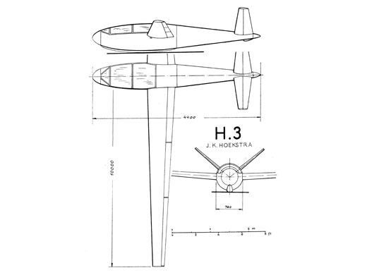 | Histoire résumée | [Traduction article Sailplanes and Glider octobre 1953] JAN K. HOEKSTRA est l’un des pilotes de planeur les plus connus aux Pays-Bas. Il est le premier pilote à avoir reçu l'indigne d'argent "C" et est titulaire du record national pour la durée depuis 1937 avec 24,04 heures. Il y a environ 20 ans, il a conçu et construit un gros biplace mais il a été emporté par une rafale sévère et endommagé au-delà de toute réparation peu après les premiers vols. Après ce "H-l" il a conçu un petit avion et il travaille actuellement sur le projet "H-3", un minuscule planeur avec une vitesse de croisière très élevée. Le "H-3" a une envergure de seulement 10 mètres (33 pieds) et une surface alaire de 5 m2 (le "Olympia" a une surface de 15 m2). L'allongement est ainsi de 20. Avec un poids total de 180 kg (395 lb), (y compris 100 kg ou 220 lb pour le pilote plus parachute, radio, etc.), sa charge alaire est de 35 kg/m2, ce qui est très élevé pour un planeur. Il utilise des profils laminaires de la série NACA 64 au saumon de l’aile et de la série 63 à l'emplanture. L’aile n’a pas de vrillage. L'empennage papillon utilise aussi des profils laminaires. La finesse maximale calculée est de 1:35 à 100 km/h (62 m.p.h.) et le taux de chute minimal de 75 cm/sec (2,5 pi/s) à 90 km/h (56 m.p.h.). La vitesse minimale avec volets sortis est de 62 km/h (39 m.p.h.). La construction du "H-3" est entièrement en bois. L’aile et le fuselage seront tous deux en sandwich, sans longerons. Le fuselage circulaire a une double peau. L’espace entre les deux peaux est rempli d’une sorte de matériau léger. Le système de contrôle de l'empennage papillon est très simple. Il n'y a pas de freins de piquée dans les ailes et Hoekstra envisage d'utiliser un parachute de queue pour l’atterrissage. La conception n’est pas encore achevée et on n'a pas d'information concernant la construction d’un prototype. Hoekstra a un atelier à Rotterdam où il construit le deuxième prototype du nouveau planeur d'entraînement néerlandais "T-10". Une version deux places de celui-ci devrait voler dans quelques mois. Note de traduction Pour acquérir l'insigne d'argent C (ou simplement insigne d'argent), le pilote doit effectuer un gain d'altitude de 1'000 mètres, un vol de 5 heures après largage et un vol de distance de 50 kilomètres au moins. Ceci peut être effectué en un seul vol ou dans des vols séparés. | ||||||