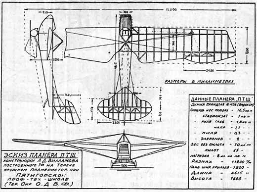 | Histoire résumée | Le 22 juin 1924, à Pyatigorks, le premier cercle de planeurs à l'école professionnelle de Pyatigorsk [Тереке кружок планеристов при пятигорской профтехнической школе] est ouvert à Terek. Avec l'ouverture du cercle, la construction du planeur "P.T.Sh." a commencé. selon les dessins de L. WILLAMOV [Л.Вилламова]. Les fonds pour la construction ont été partiellement collectés par sous forme d'abonnement et de dons, une partie des fonds étant allouée par le Terek ODVF [Терекское ОДВФ]. La construction du planeur n'a pas pu être achevée avant le début du concours de Crimée, en septembre 1924. Le planeur ne fut prêt qu'à la fin de la première semaine d'octobre 1924. Il fut testé en vol à partir des collines situées à proximité de Piatigorsk. Les vols ont été effectués en remorquage derrière une automobile voiture. | ||||||