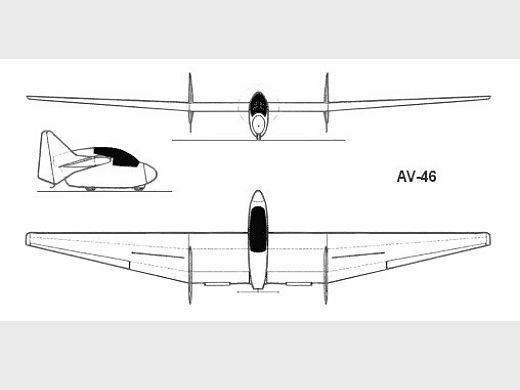 | Histoire résumée | L'AV-46 était un projet de motoplaneur biplace, dérivé de l'AV-45 (dont il reprenait l'architecture générale) et de l'AV-22 (dont il reprenait le cockpit en tandem). L'étude de cette machine fut entamée en 1961. L'aile était de construction analogue à celle de l'AV-45, mais présentait toutefois un allongement légèrement supérieur. Le bord d'attaque était droit, l'ensemble de la voilure étant doté d'une flèche inverse peu marquée, destinée à minimiser les effets des variations de centrage. La motorisation devait faire appel à un moteur de 45 à 50 ch. La construction de l'AV-46 ne fut jamais entamée. | ||||||