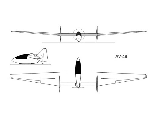 | Histoire résumée | L'AV-48 était un motoplaneur d'architecture analogue à l'AV-45, mais doté de performances sensiblement supérieures. Conçue à partir de 1960, cette machine faisait appel à une structure en fibre de verre et à un profil laminaire Wortmann FX-66H159. Un incendie de l'atelier dans lequel cette aile volante devait être construite suspendit le développement de ce projet, qui fit par la suite l'objet de quelques modifications, avec notamment une envergure agrandie d'une soixantaine de cm (passant à 16,70 m). Dans ce dernier projet, la finesse maximale aurait pu atteindre 36. Il ne fut malheureusement pas possible à Charles Fauvel de poursuivre le développement de cette machine avant son décès en 1979. | ||||||