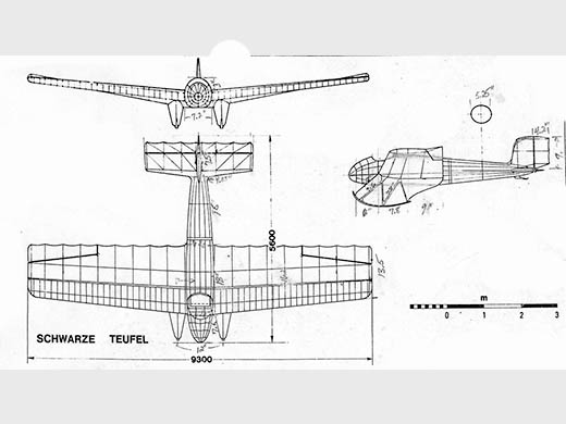 | Histoire résumée | Une compétition de vol sans moteur est organisée à la Wasserkuppe en août 1920 par Oskar Ursinus (cet évènement deviendra annuel et très connu sous le nom de concours de la Rhön). En réponse, le professeur Theodore von Kármán (aérodynamicien réputé) et Wolfgang Klemperer ont formé un groupe de recherche aéronautique à l'Université d'Aix-la-Chapelle appelé Flugwissenschaftlichen Vereintung Aachen, FVA (Aachen Flight Research Association de recherche sur le vol d'Aachen) pour concevoir et construire des planeurs. Pour la réunion de Rhön en 1920 à Wasserkuppe, la FVA construit un planeur monoplan. Cet appareil, le FVA-1 Schwarze Teufel (ou Schwatze Düvel), a été construit sans autorisation officielle, sous couvert de recherche aérodynamique, et transporté secrètement par chemin de fer à la Wasserkuppe (un étudiant intrépide a passé tout le voyage sous la bâche avec le planeur). En raison des difficultés de transport, leur arrivée à Wasserkuppe a été retardée, mais heureusement, la compétition a été prolongée en raison du mauvais temps persistant. A la Wasserkuppe KLEMPERER a piloté le FVA-1 à trois reprises le 3 septembre, effectuant les premiers lancements à l'élastique, un système conçu par Klemperer lui-même. Le vol le plus long de la journée a été de 1,830 km (1,137 mi) avec une durée de 142 s, beaucoup plus longue que la meilleure durée de la compétition, réalisée par PELZNER dans son deltaplane, de 452 m (1 480 ft) en 52 s. Le FVA-1 a de nouveau volé le 7 septembre dans un fort vent de 30 nœuds (56 km/h), gagnant en fait 30 m de hauteur en survolant la crête, avant d'atterrir. Deux autres pilotes ont piloté le FVA-1 ce jour-là, mais l'avion a été sérieusement endommagé lorsque le troisième pilote a décroché et s'est écrasé de façon spectaculaire. Le Schwatze Düvel a été réparé et a revolé à la Wasserkuppe l'année suivante, en aoû pour la réunion de Rhön en août 1921. | ||||||