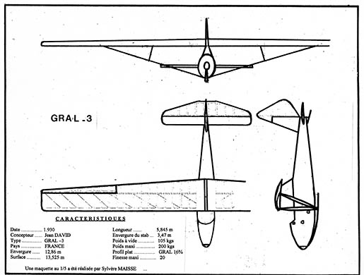 Le GRAL a commencé la construction de son quatrième planeur durant le deuxième trimestre 1930. Le Gral-3 a été étudié par Ferdinand BEAU et Jean DAVID, ce dernier ayant dessiné les plans. Le Gral-3 encore en construction fut exposé à la foire commerciale de Rouen en juin 1930. En septembre 1930 le Gral-3 était terminé (il devait participer à la Quinzaine de Sens mais ne put arriver à destination à la suite d'un bris de la remorque le transportant !) mais les premiers essais n'eurent lieu qu'à partir du 11 janvier 1931. L'appareil fut détruit lors d'un vol de Ferdinand Beau le 5 avril 1931 (rupture du pied de manche en approche).