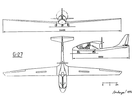 | Infos techniques | Début de la construction du motoplaneur G27 avec hélice propulsive et train rétractable. Aile en fibre de verre et coque en tube d'acier. | ||||||