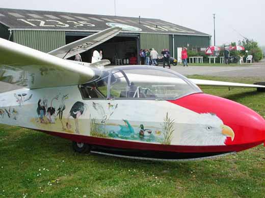 | Le PH-314 a été construit sur l'ordre de l'Eindhovense Aero Club, département Vol à voile (EAC) en 1963. Le 1 avril 1979 il est racheté à l'EAC par 9 membres du club (dont Henk van der Heijden). Dans les années quatre-vingts l'artiste Jan van Alphen a décoré le PH-314 d'une façon très originale. Le planeur a été baptisé Weilandexpres (Express de campagne) à cause de son grand nombre de vaches. En 2002 Jan van Alphen a redécoré le Ka-7 sur le thème des "Oiseaux Libres". Site de Henk van der Heijden |